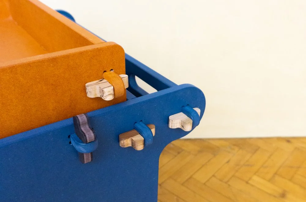 Responding to the call out from the Crafts Council for makers and sponsored by the Richard Seager Arts and Crafts Design Award, the Craftmobile provides a robust, playful and mobile station to house self directed activities for families including artist samples, sensory objects, looking tools and books. Utilising the through tenon joint from the Peg Range, a bespoke piece of mobile furniture was designed that also houses stools, trays and trestles that can be made by families for more focused activity spaces. The inlaid symbols, colours, individual stool designs and name were all created through hands-on Co-Creation workshops with local families.